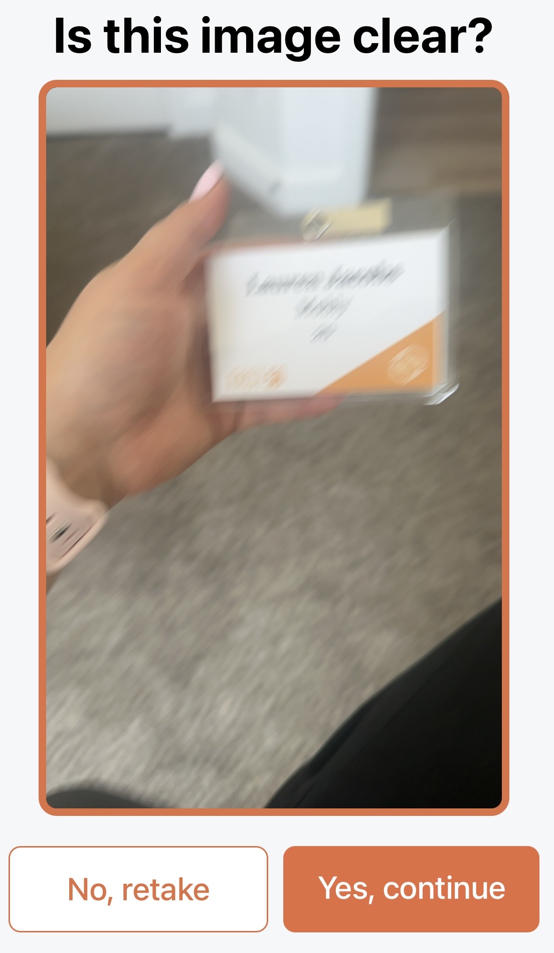 If the OCR doesn't detect any text, you'll receive an alert with the option to retake the photo or proceed with the current one. While OCR isn't always perfect, if your image is clear, the other steps in the enrichment process can still extract the necessary information.