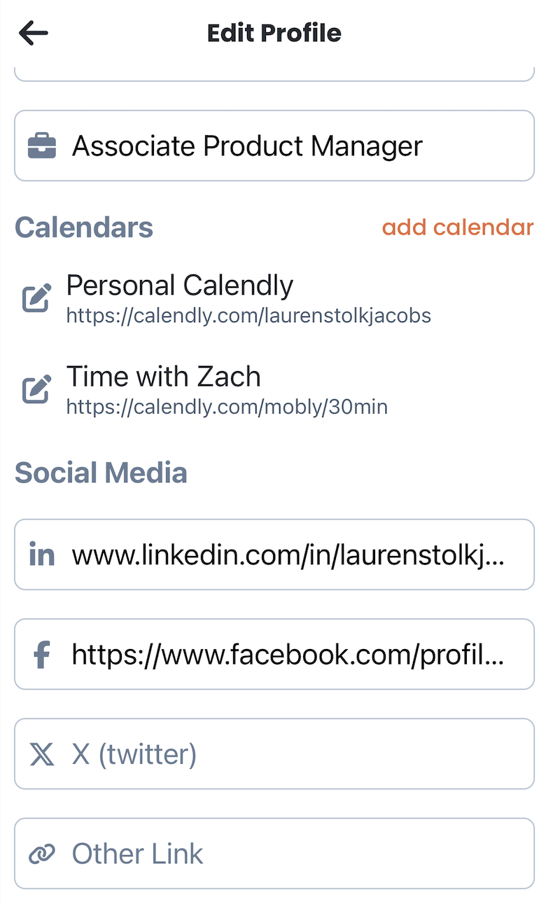Make sure your calendar links are configured in Mobly before you book with your lead. To do so in the mobile app, tap your own profile picture, then tap "Edit Profile". Scroll down to find the calendar section.