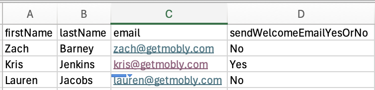 The users you upload will not receive a welcome email by default. To change this, use the Send Welcome Email field ("Yes" or "No"). Typing "Yes" in this column sends an immediate email with login instructions from support@getmobly.com after upload. Typing "No" or leaving that field blank will skip sending the email, which can be sent manually later.