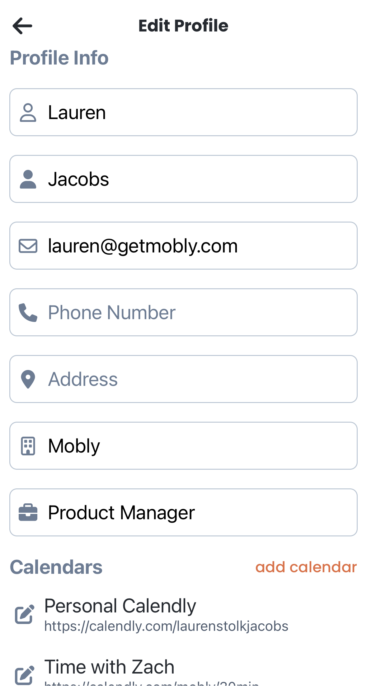 Edit any profile fields that you would like. These fields include First Name, Last Name, Email, Phone Number, Address, Company, Job Title, Meeting Calendar Link, LinkedIn, Facebook, Twitter, or Other Link. You can even add your personal or team calendar link to easily book meetings with your leads.