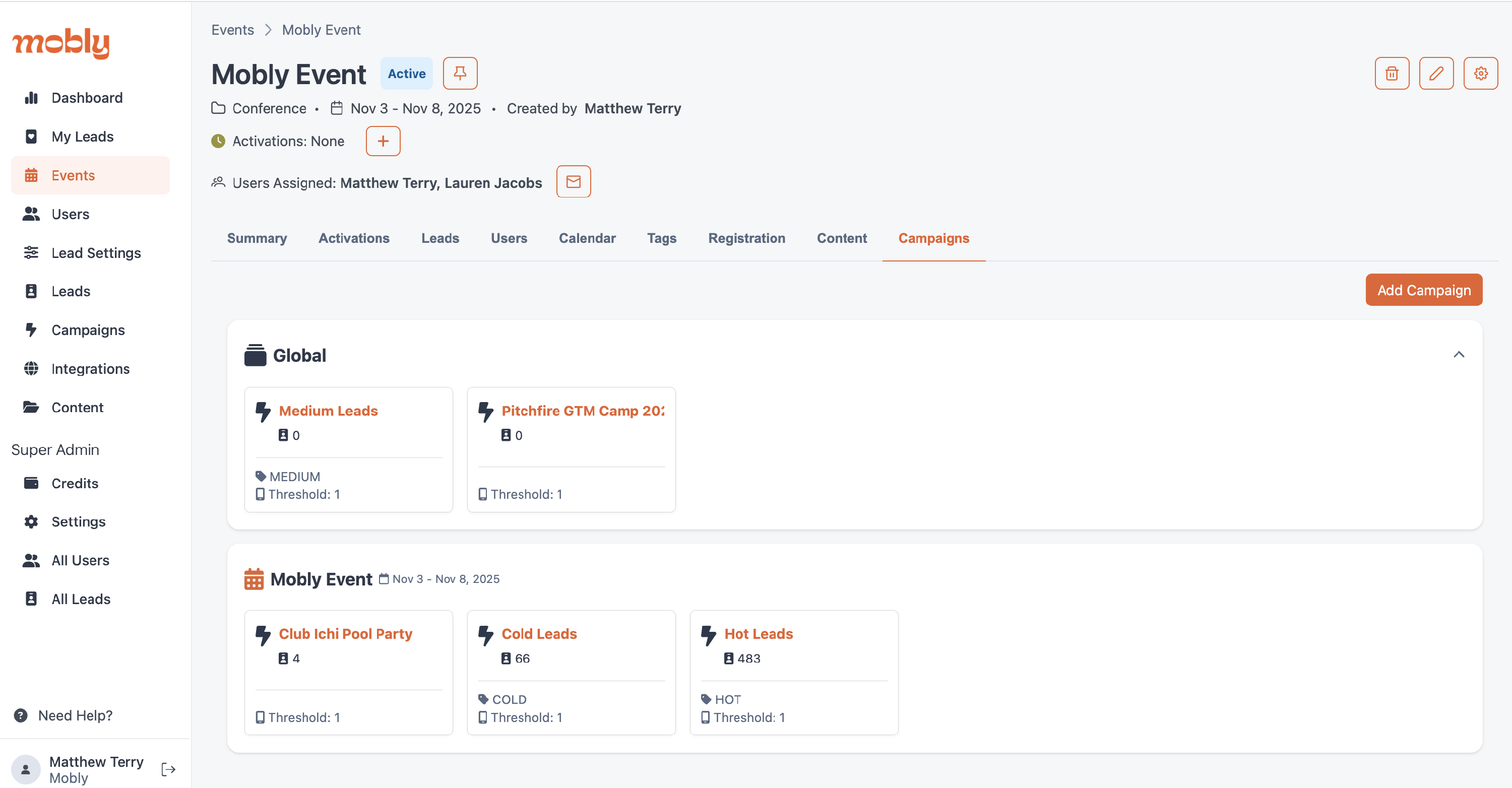 Assign Mobly campaigns to your leads on an event-by-event basis without doing repetitive CRM or MAP configuration for each event. You can even configure Mobly campaigns to be sensitive to specific tag groups, allowing for personalized follow-ups based on industry, product, or lead score.