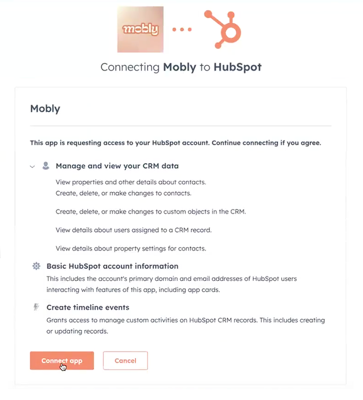 - Authenticate the HubSpot + Mobly connection by installing from the HubSpot App Marketplace