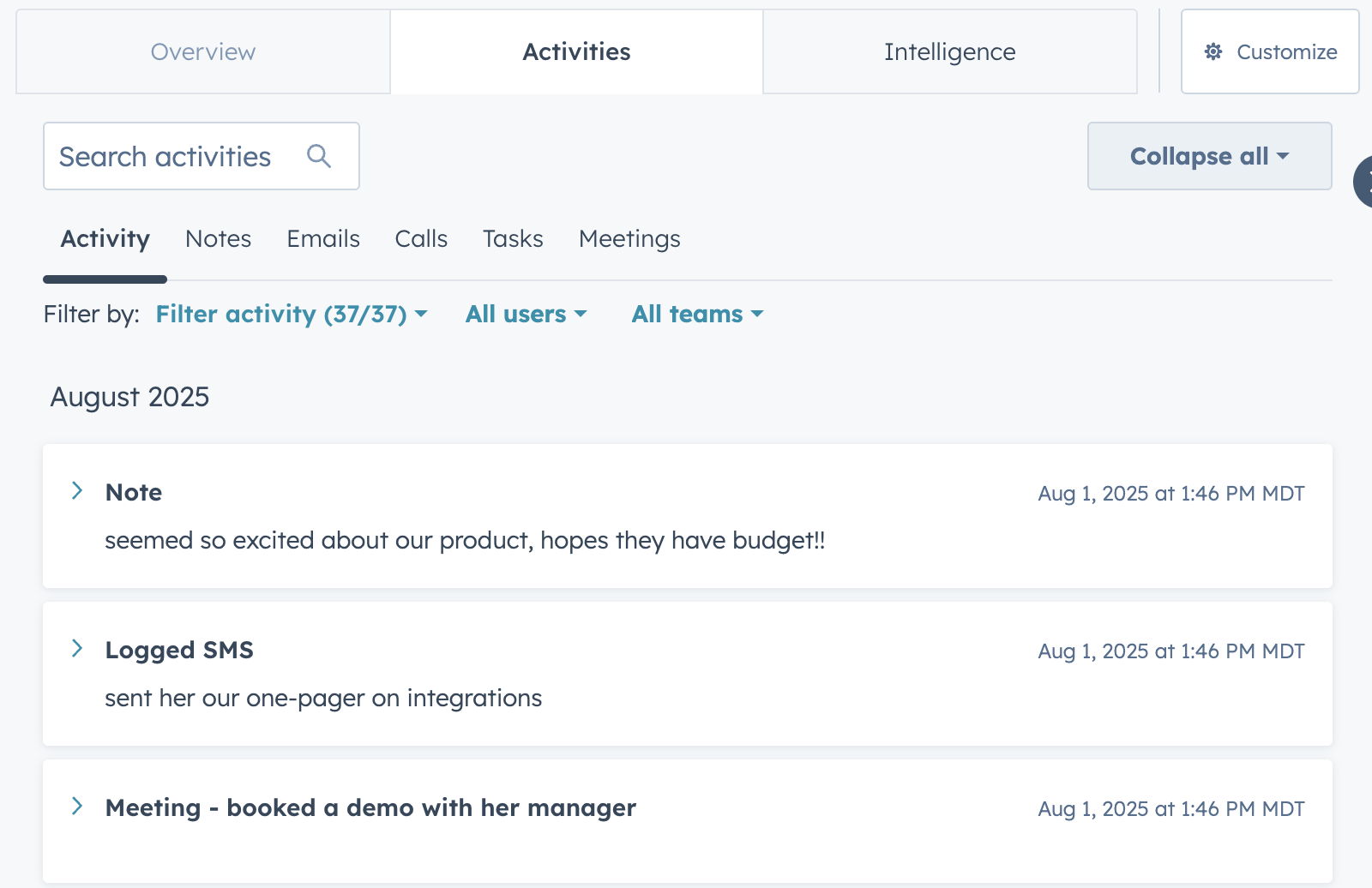 Mobly logs all interactions with leads in HubSpot under the activity timeline.